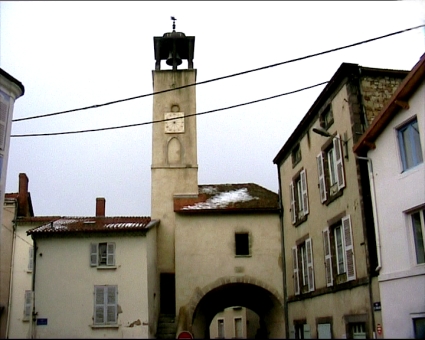 La porte du village médiéval. Le clocher, bien que foudroyé il y aquelques années, a été restauré
