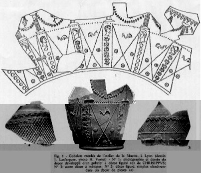 (6) H. VERTET, A. et J. LASAERGUES, Observations sur les gobelets d'ACO de l'Atelier de la Muette (Lyon). R.A.C. J. LASFARGUES et H. VERTET, Les frises supérieu-res des gobelets lyonnais du type ACO, R.A.C.; VI, 3, pp. 272-3.