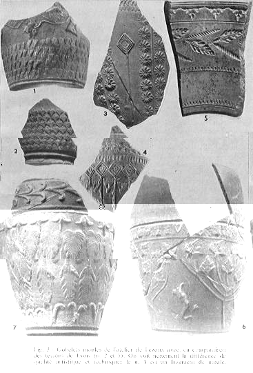 L'atelier que nous avons fouillé à Lezoux porte la marque d'une décadence certaine. Plusieurs observations montrent qu'il a existé une période antérieure plus belle. Il en subsiste des moules habilement faits. Mais déjà, plusieurs apports extérieurs se sont mêlés. Les mêmes poinçons servent aux coupes carénées (fm. 29), aux calices, aux skyphoi ainsi qu'aux gobelets. De là les mêmes assemblages se retrouvent sur les uns et les autres. Toutes ces formes sont revêtues du même engobe rouge, sauf quelques unes, comme je l'ai dit, de glaçure plombifère.
