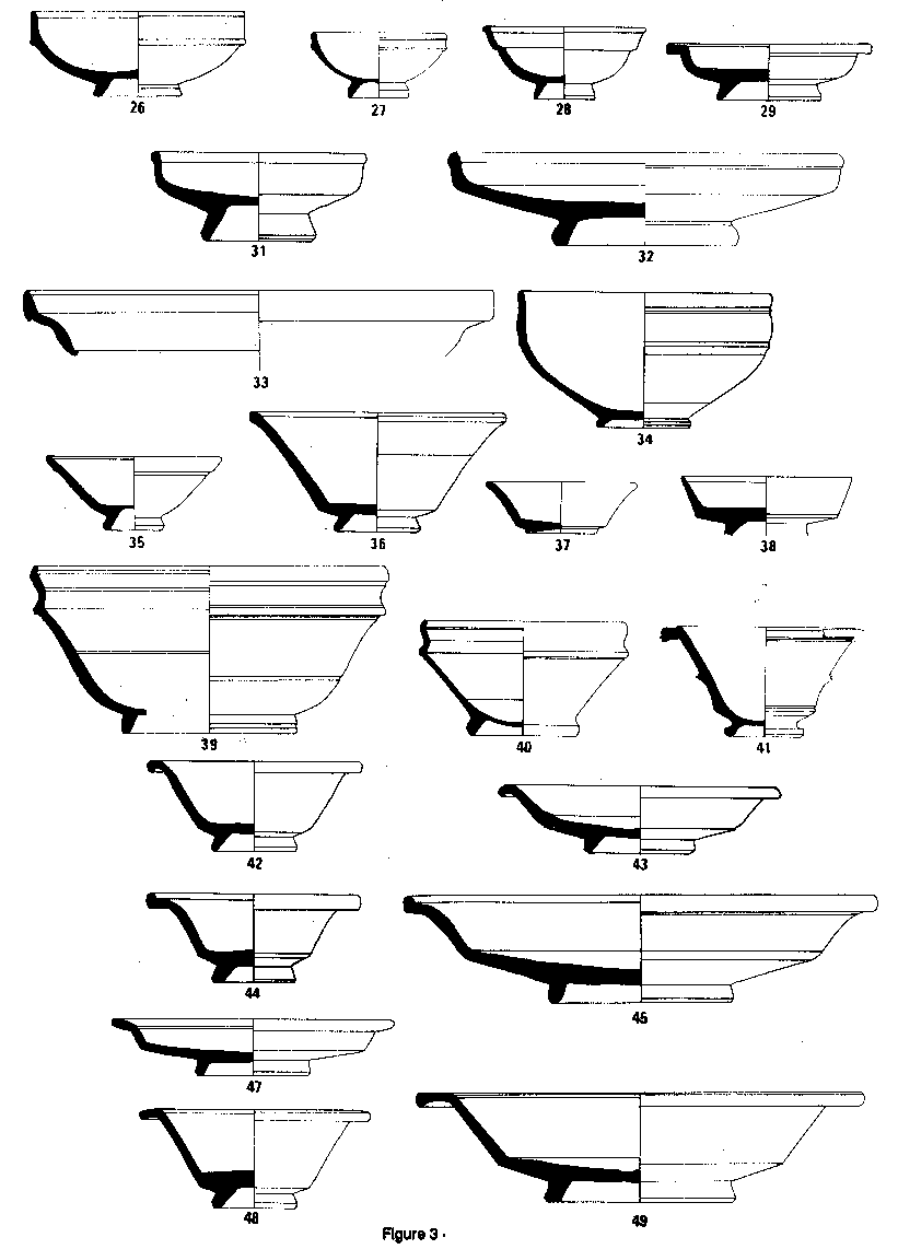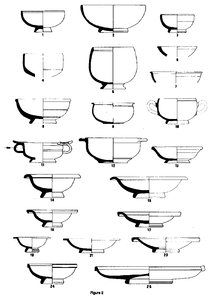 No 24 (coupelle) et 25 (coupe) : Ces formes correspondent à celles qu'Oswald et Pryce avaient rattachées au Drag. 42. Cependant, il apparaît nettement qu'il s'agit de formes différentes, tant par l'aspect de la lèvre qui est ici en bandeau droit, parfois décollé, sur laquelle s'appliquent deux anses et qui est soulignée par un ressaut, que par son type d'estampillage. Ce dernier consiste soit en une estampille épigraphique appliquée au-dessus d'une petite marque curviligne tracée à la main levée, soit en cette simple marque. L'un des points communs avec le Drag. 42 reste celui de sa chronologie, qui est sensiblement identique.