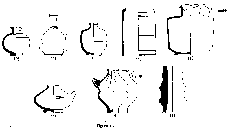 No 105 : Cruche globulaire munie d'une anse et d'une lèvre en large bourrelet. Il s'agit d'une production des phases 6 et 7.